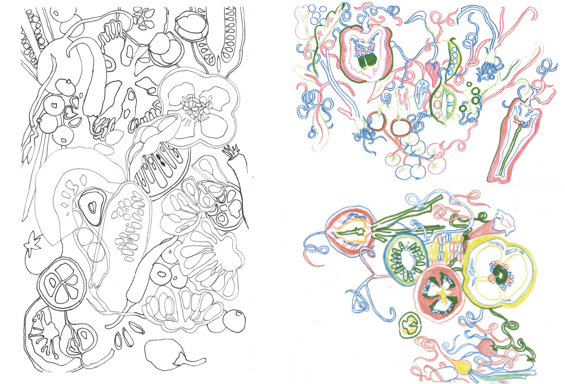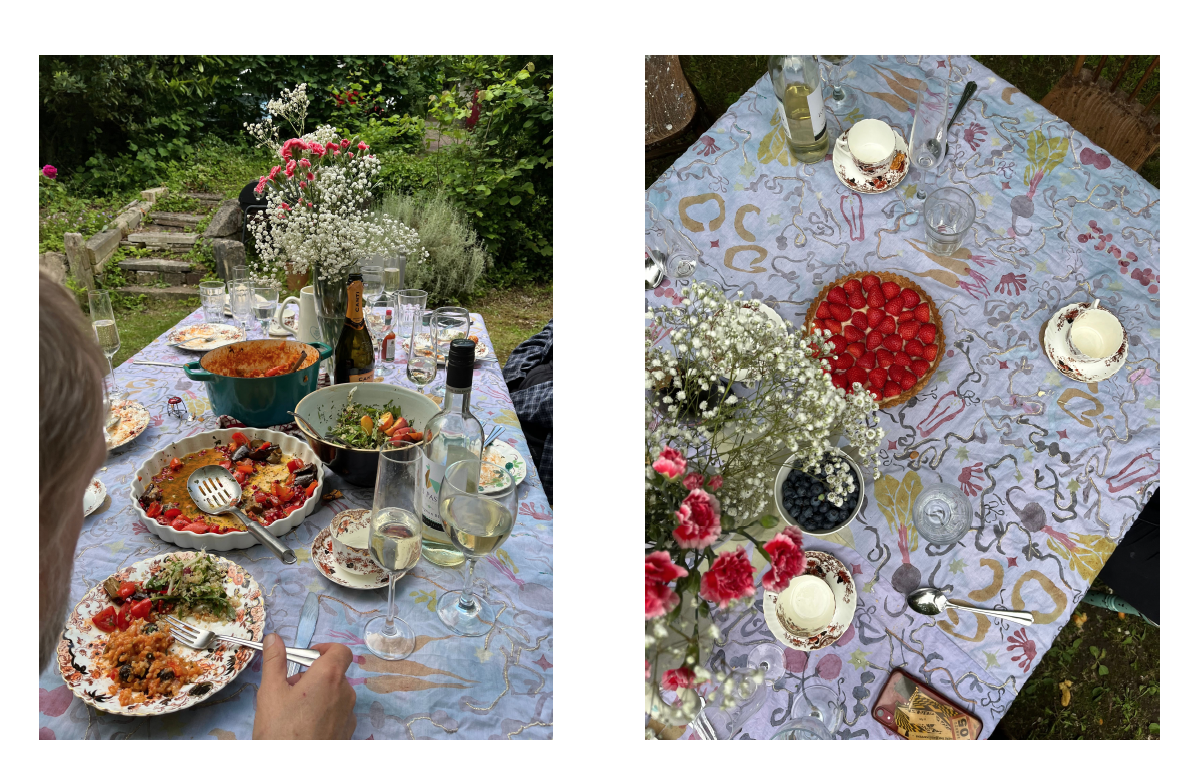 Drawing from my theoretical research on the concept of ‘slow food’ which encourages mindful cooking and eating, I made a tablecloth using sustainable natural dye processes and second-hand materials. The tablecloth then became an active site for communal eating and acted as a performative installation which I documented in a series of photographs. Both colour theory and the formal elements of pattern design were crucial elements of this project. Inspired by botany, seasonal cycles and the healing properties of nature, my illustrations show twisting roots, seeds and vegetables which were transferred onto the tablecloth using stencils